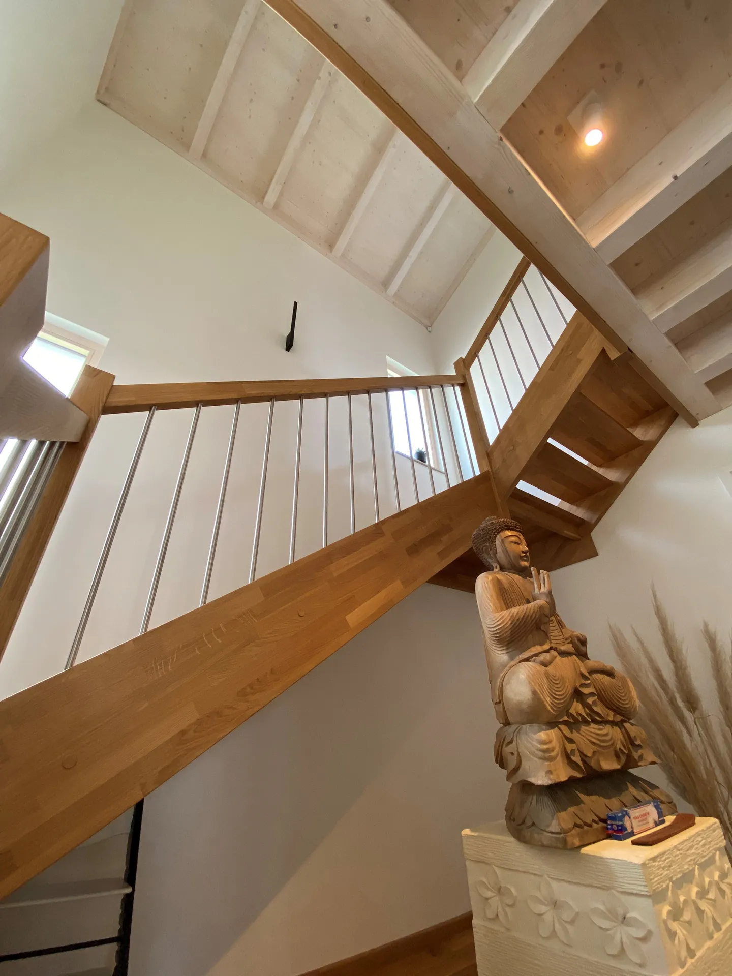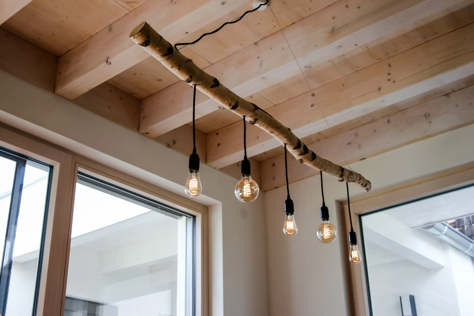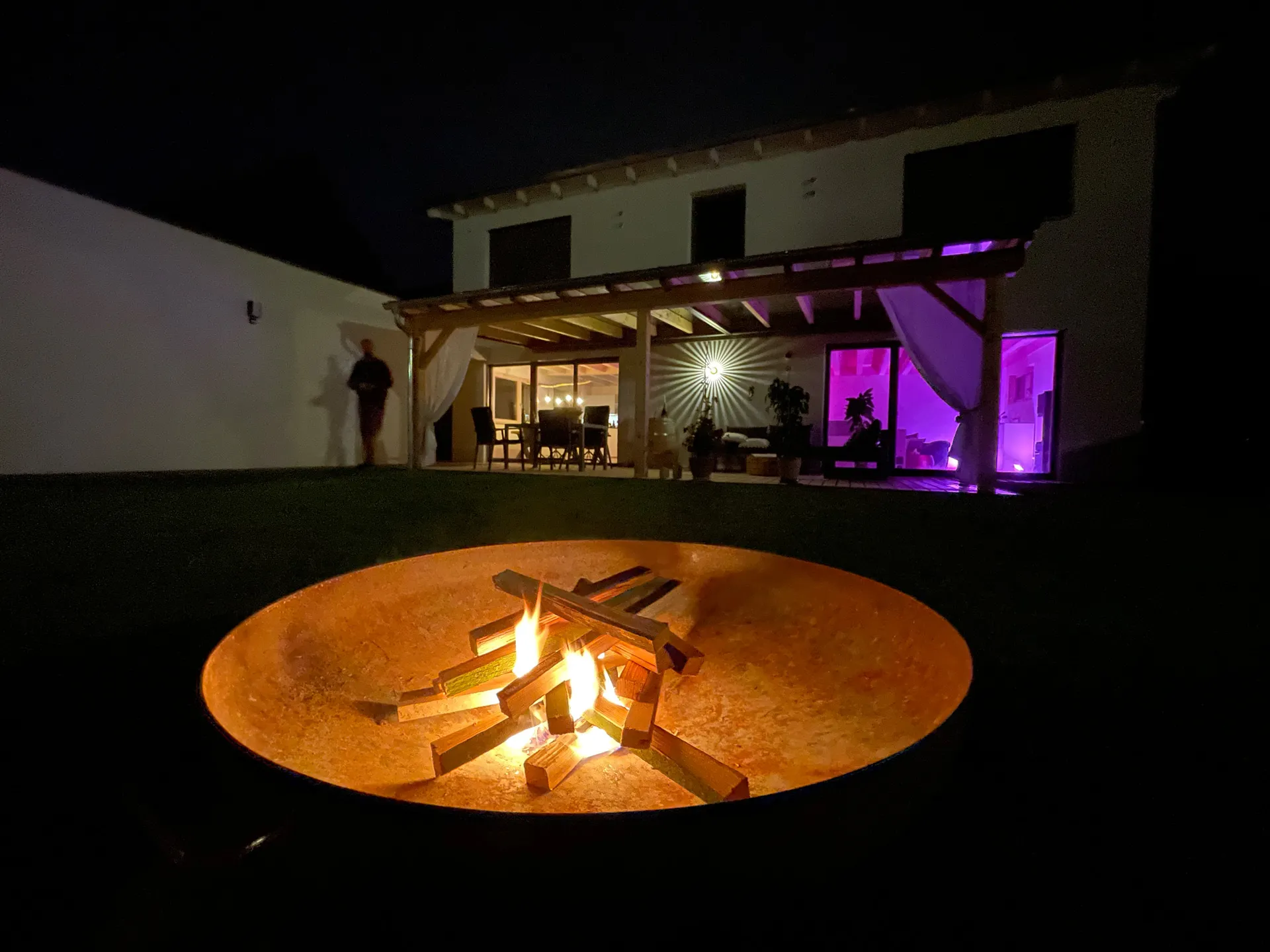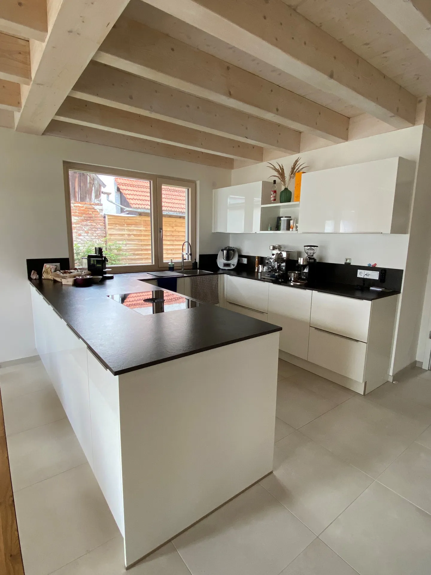 Wellnessoase im Badezimmer; Fensterbänke aus Naturstein; großzügige Pergola; Holzbalkendecke im UG; Sichtdachstuhl im OG; große Schiebetür als Raumtrenner zwischen Ess- und Wohnbereich