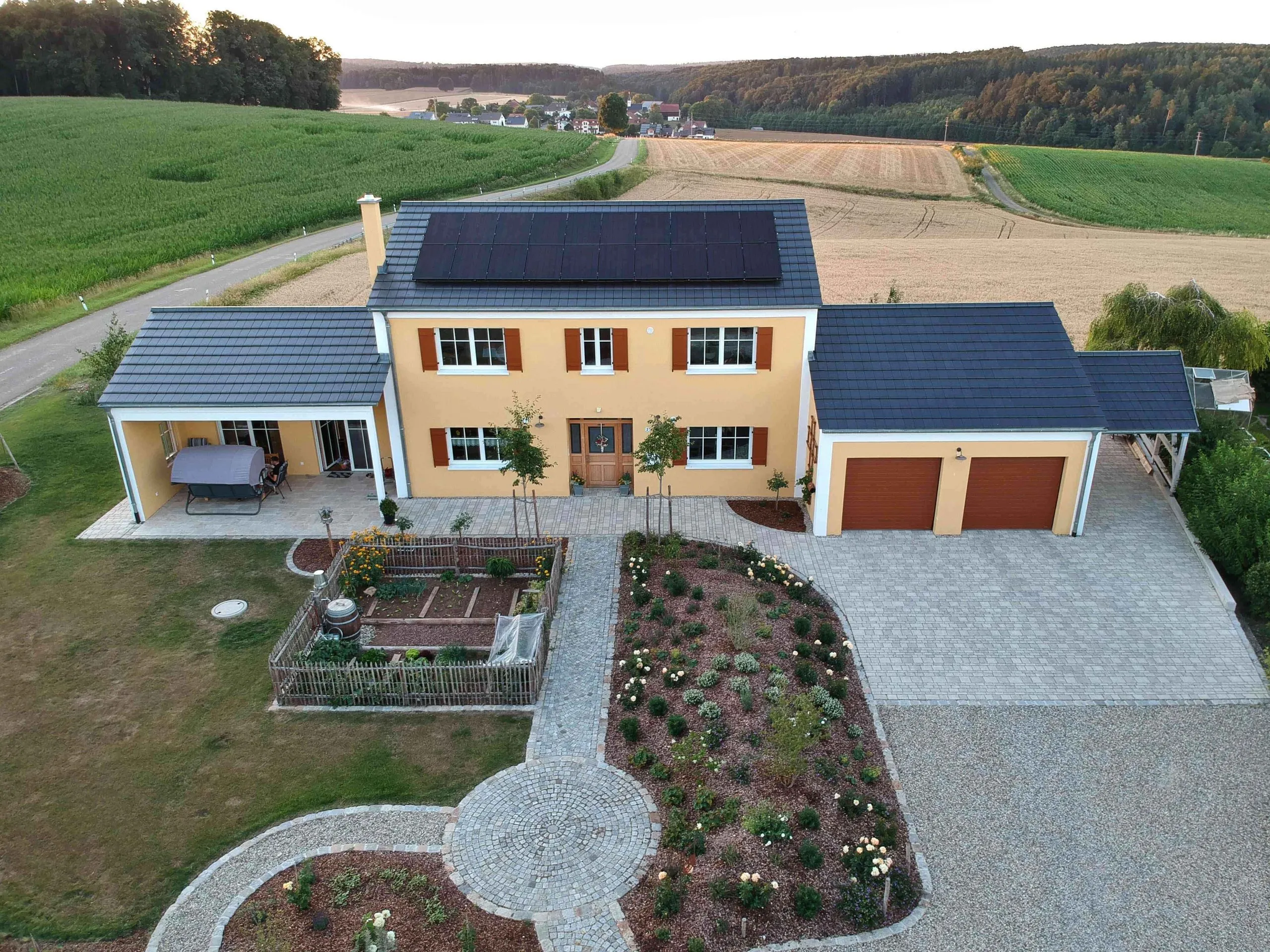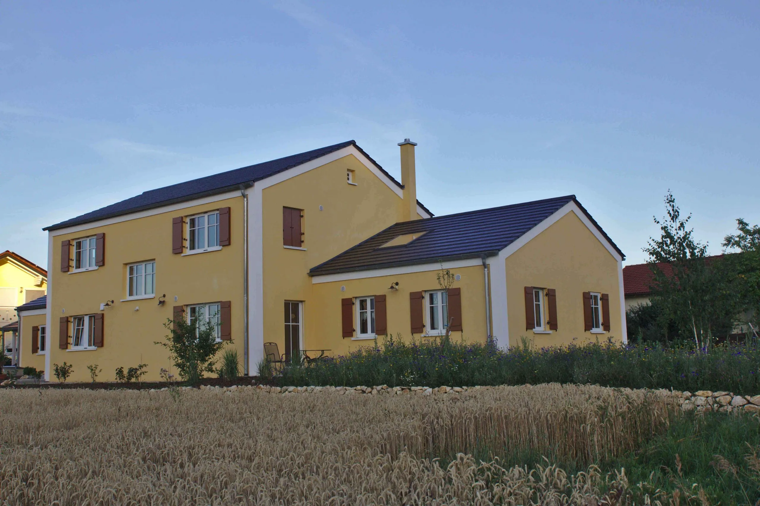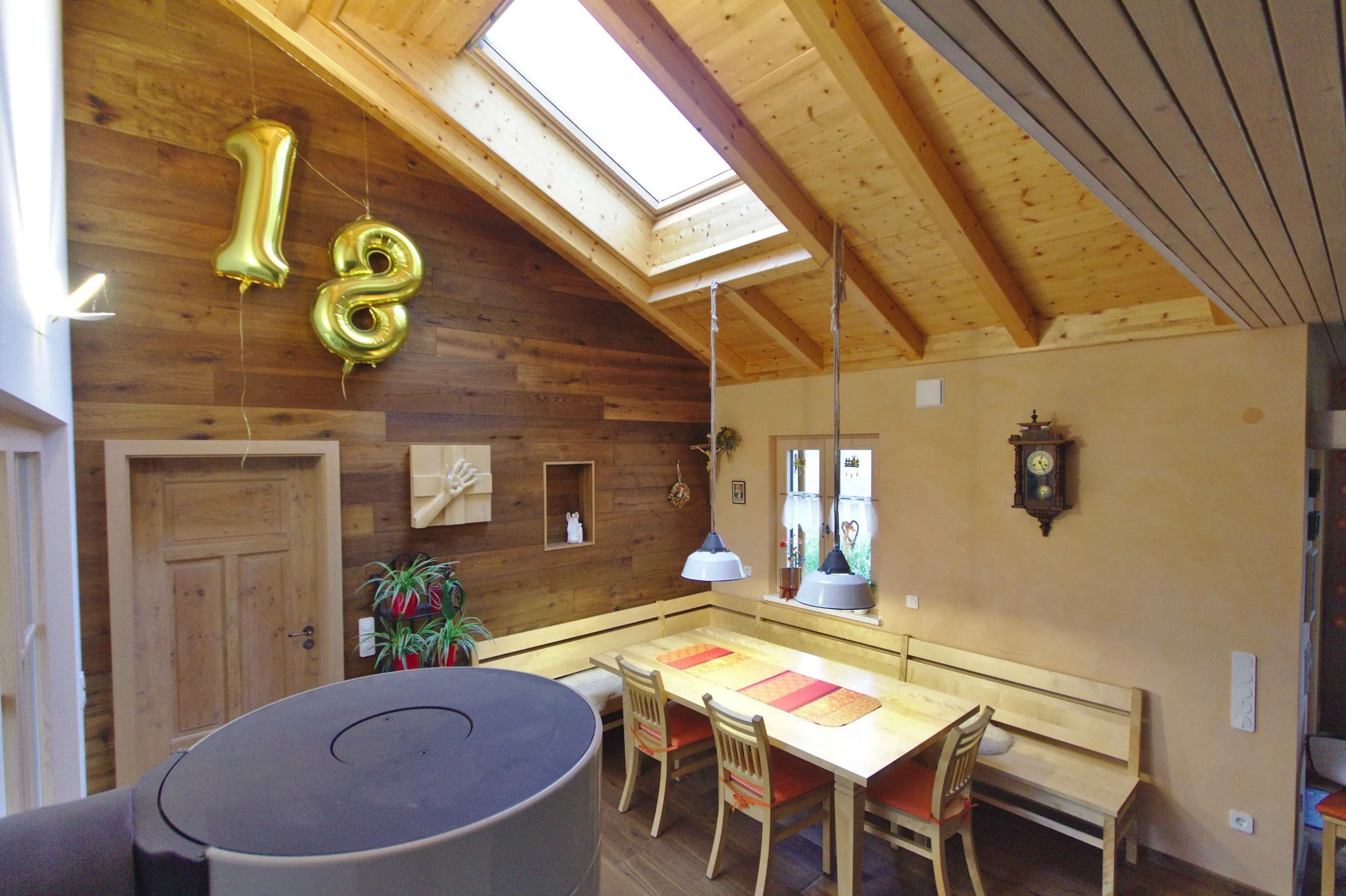 Jura-Landhaus-Stil mit Fensterläden (mit Kurbeln) und einer mit Eichendielen verkleideten Esszimmerwand.