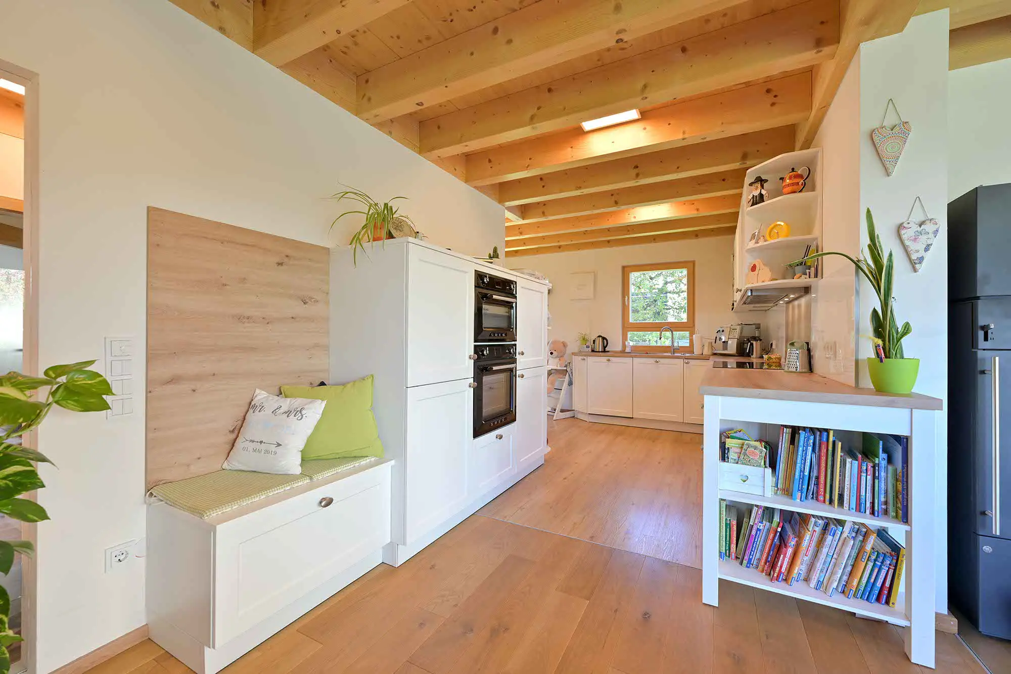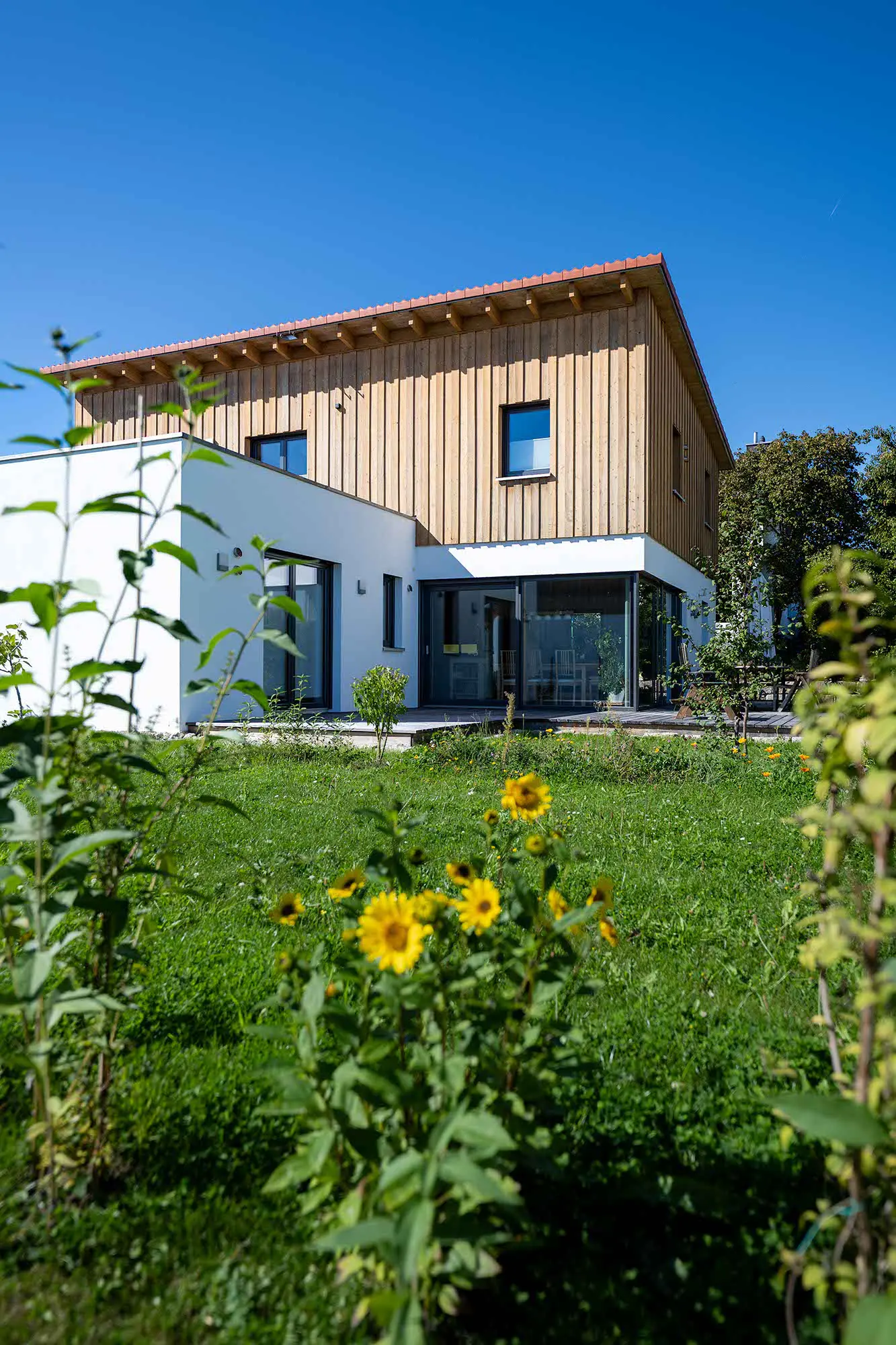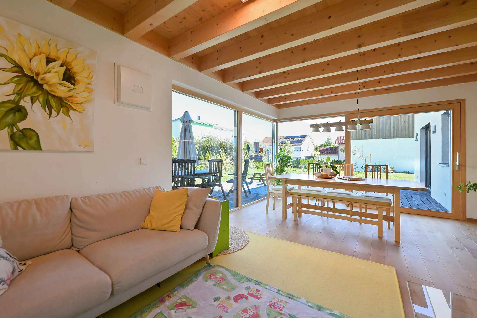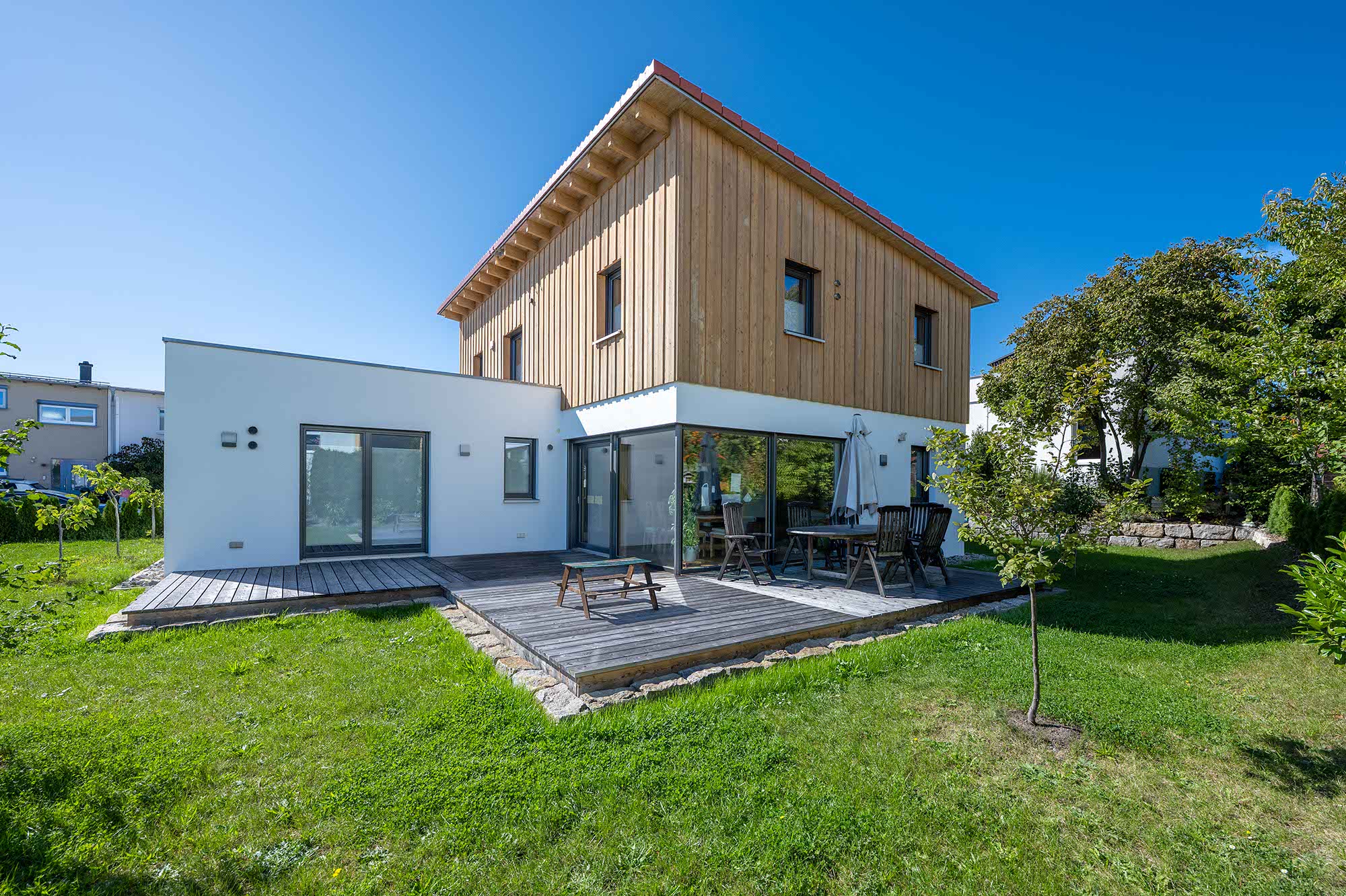 Einfamilienhaus mit Einliegerwohnung im Flachdachanbau, große Fensterfront im Essbereich