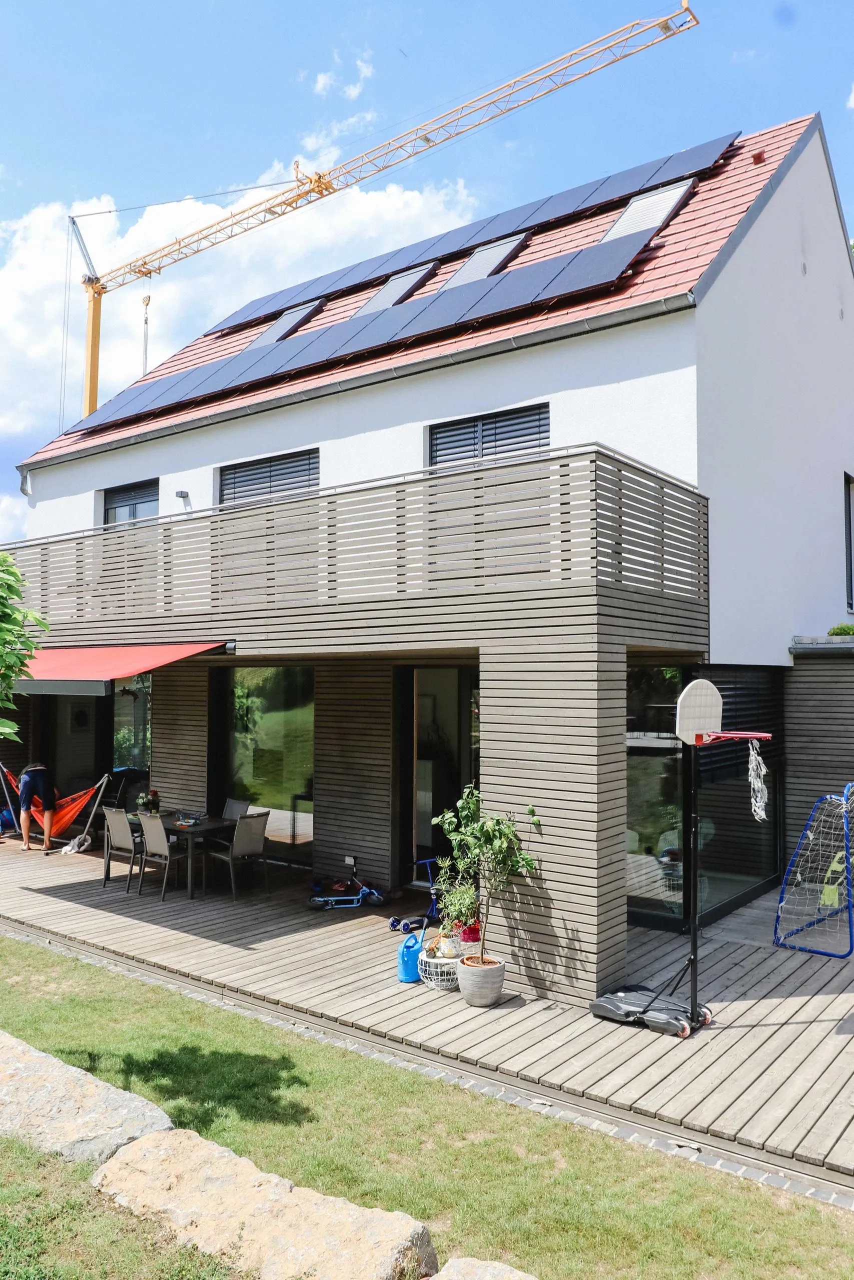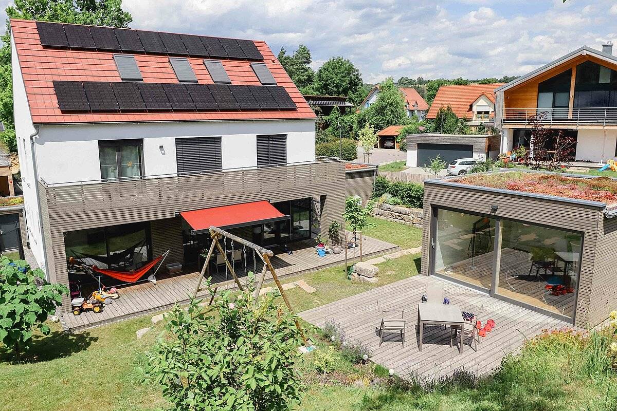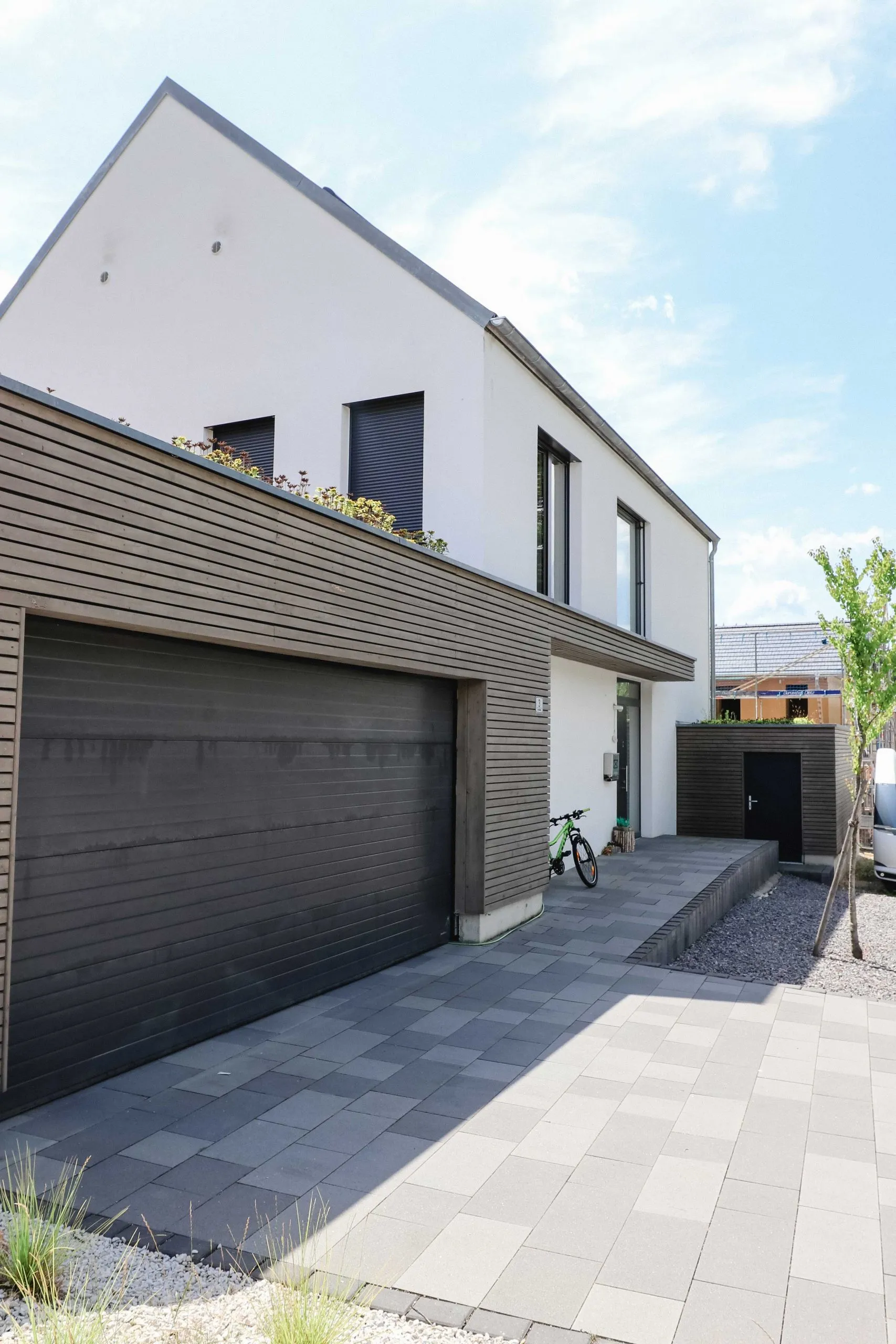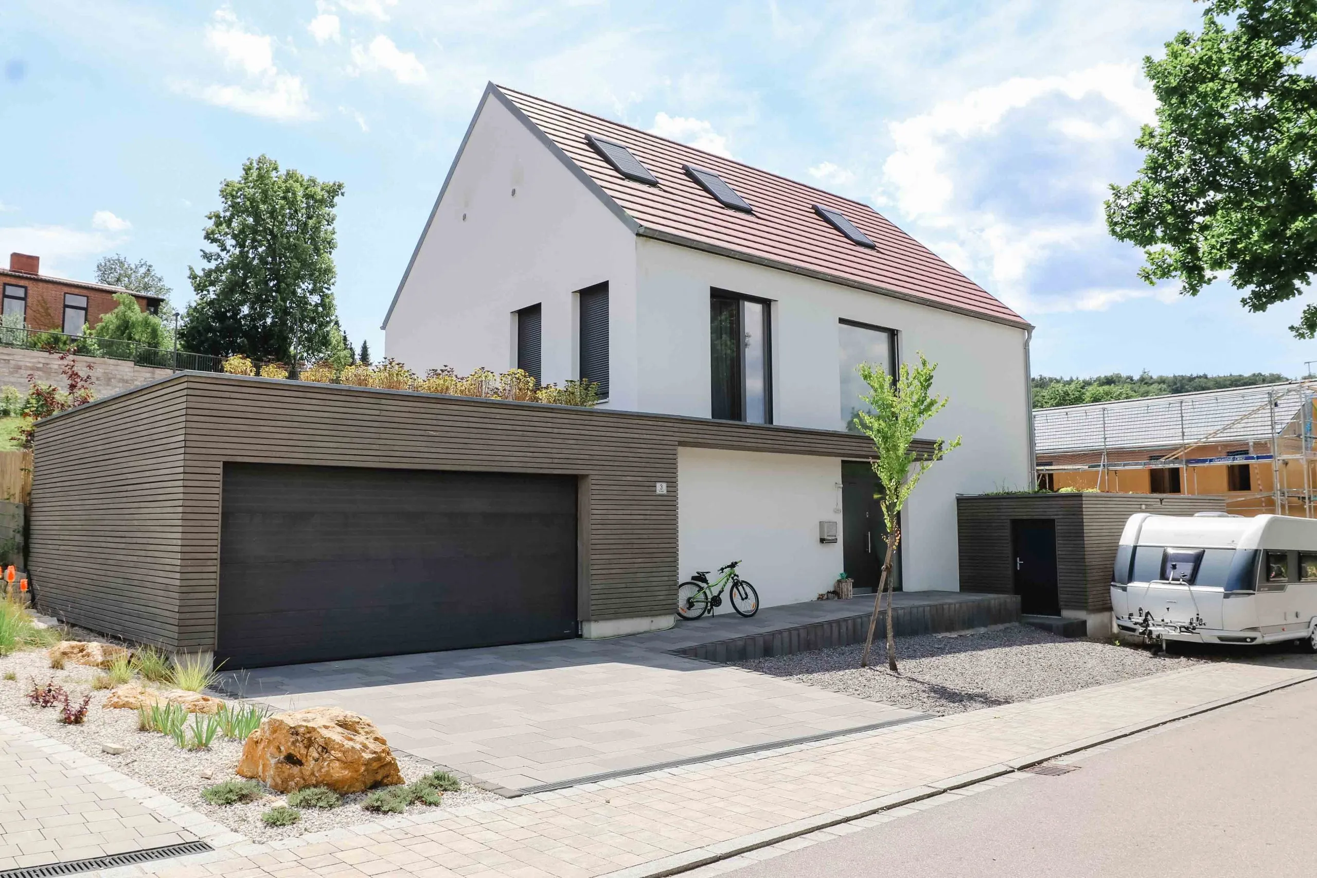 Steiles Dach ohne Dachüberstand, Garage und Anbau mit vorvergrauter Leistenschalung, Offenes Treppenhaus mit Galerie, Partyhaus im Garten, eindrucksvolle Sauna im Bad integriert
