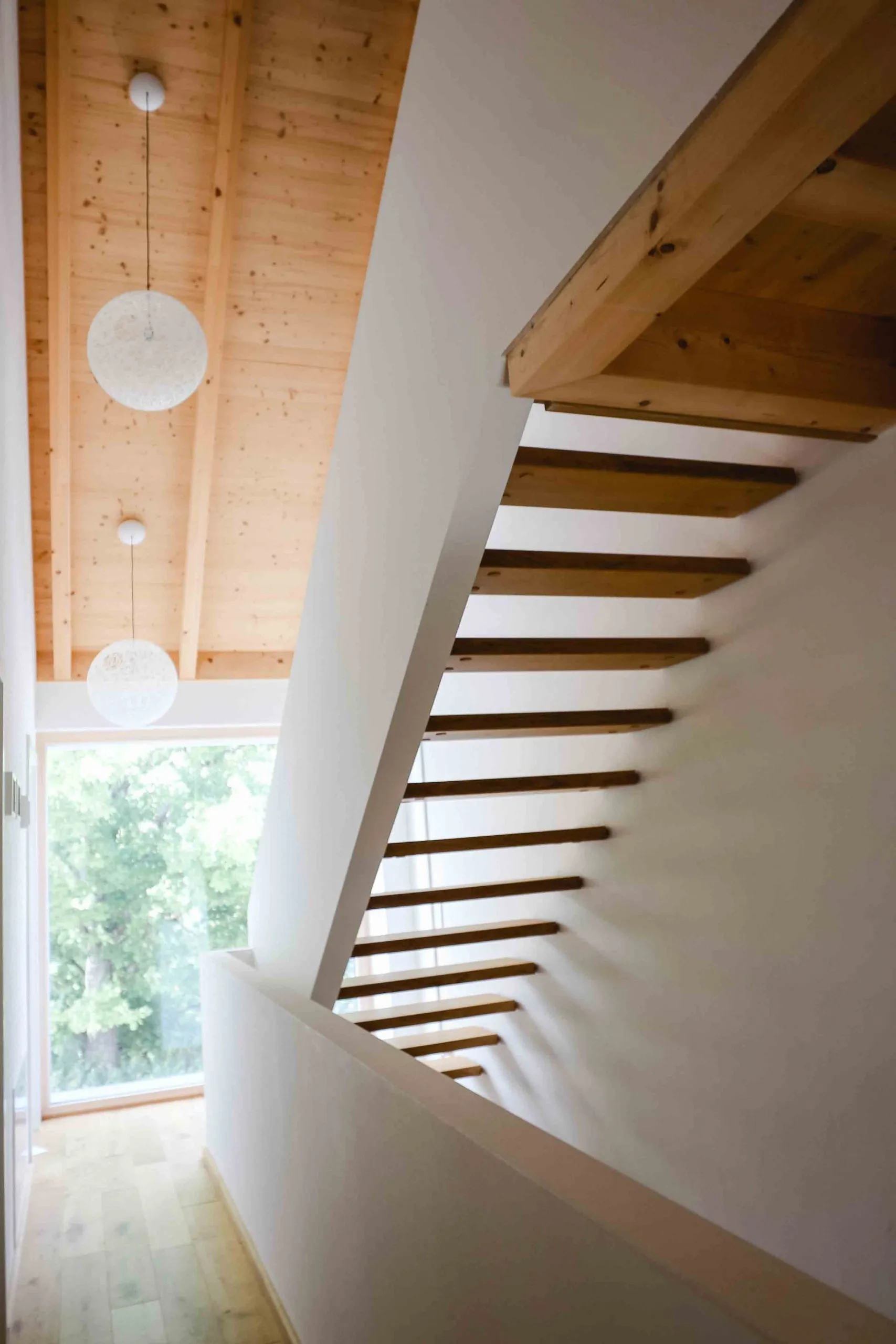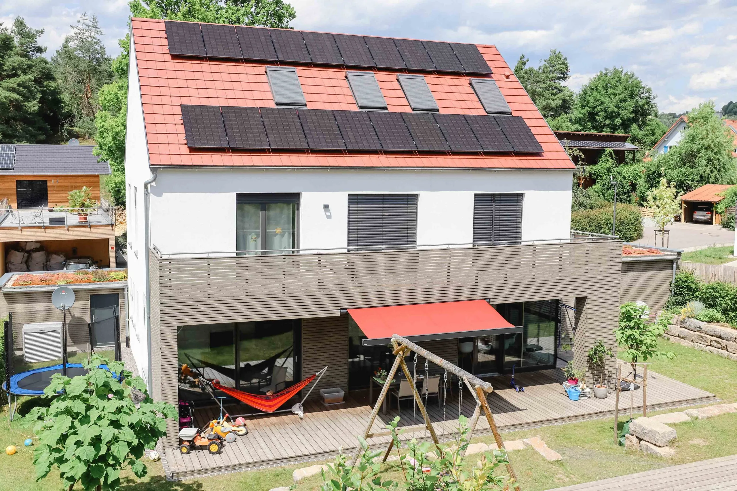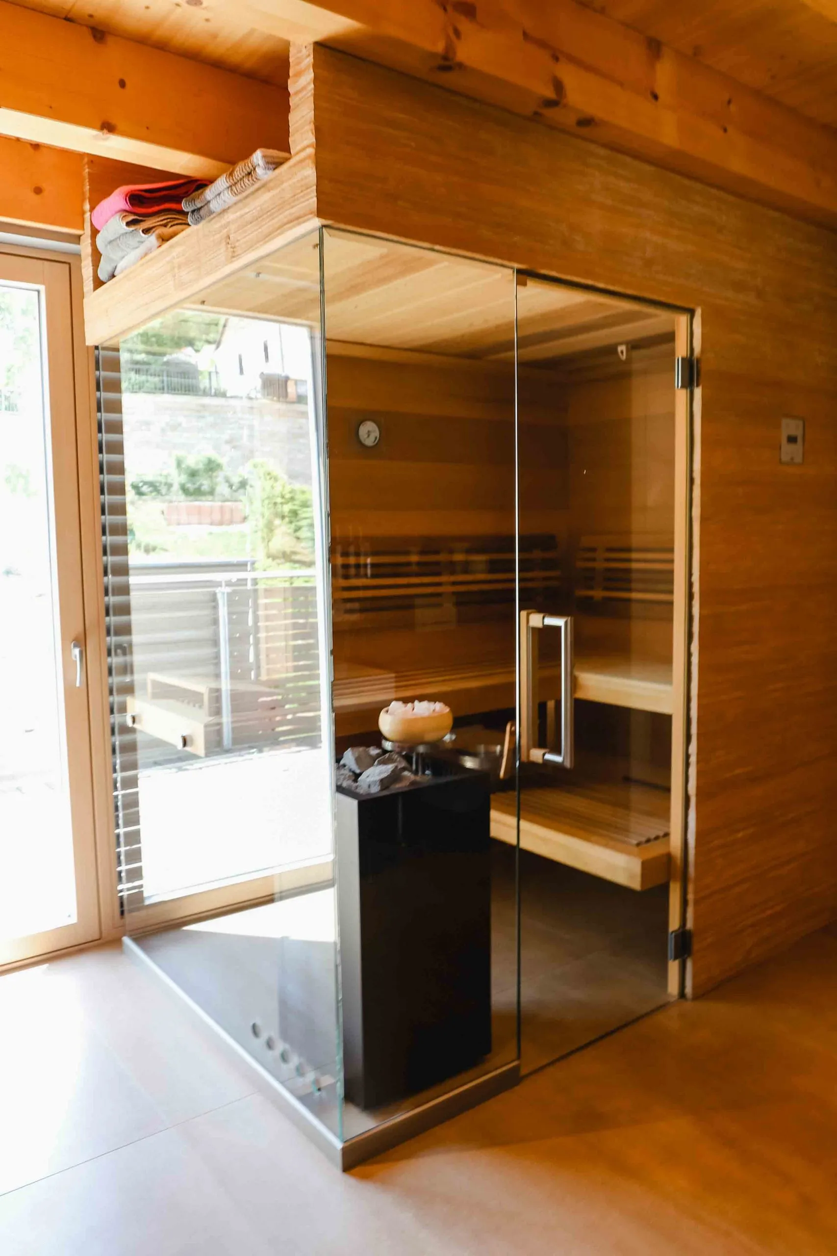 Steiles Dach ohne Dachüberstand, Garage und Anbau mit vorvergrauter Leistenschalung, Offenes Treppenhaus mit Galerie, Partyhaus im Garten, eindrucksvolle Sauna im Bad integriert