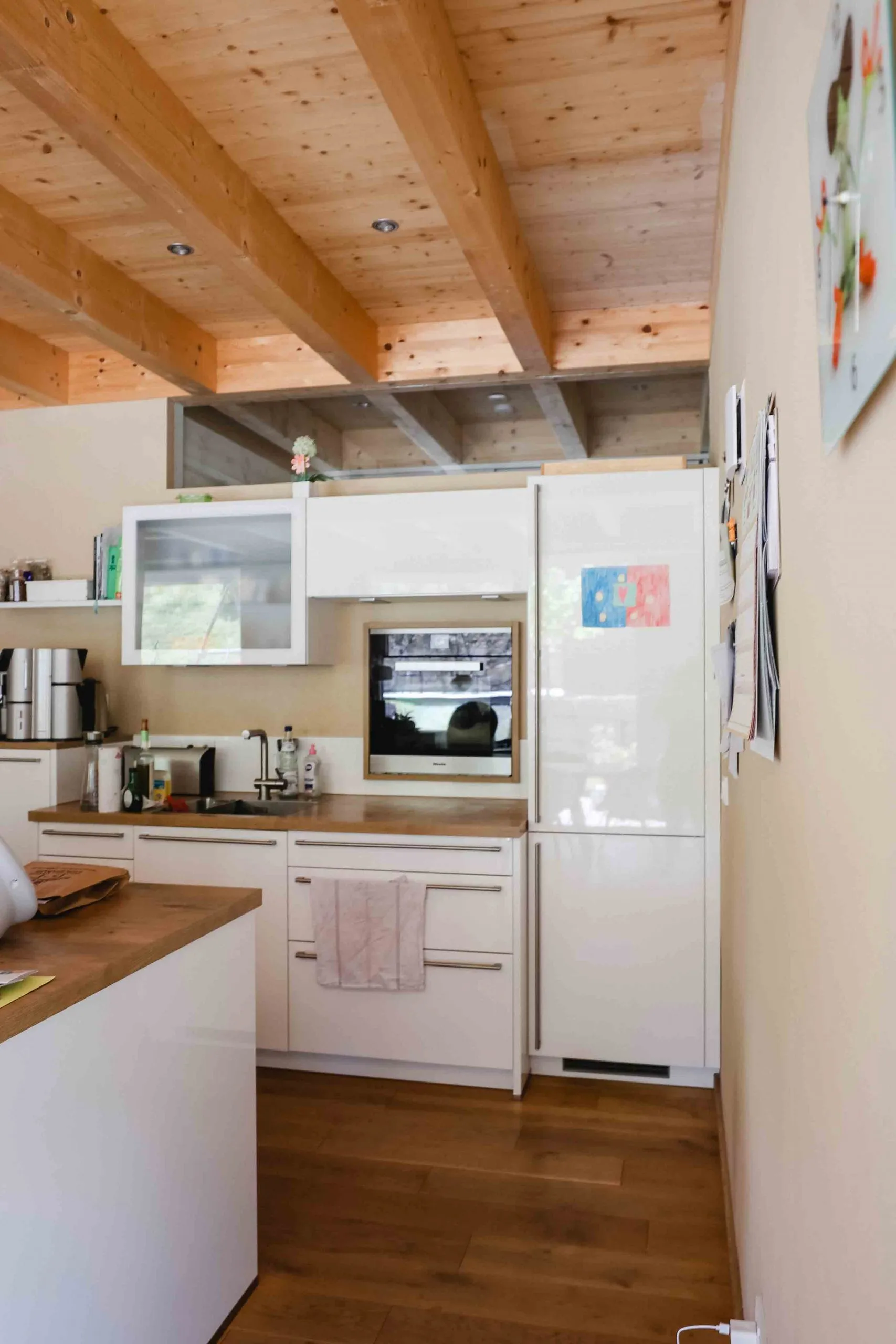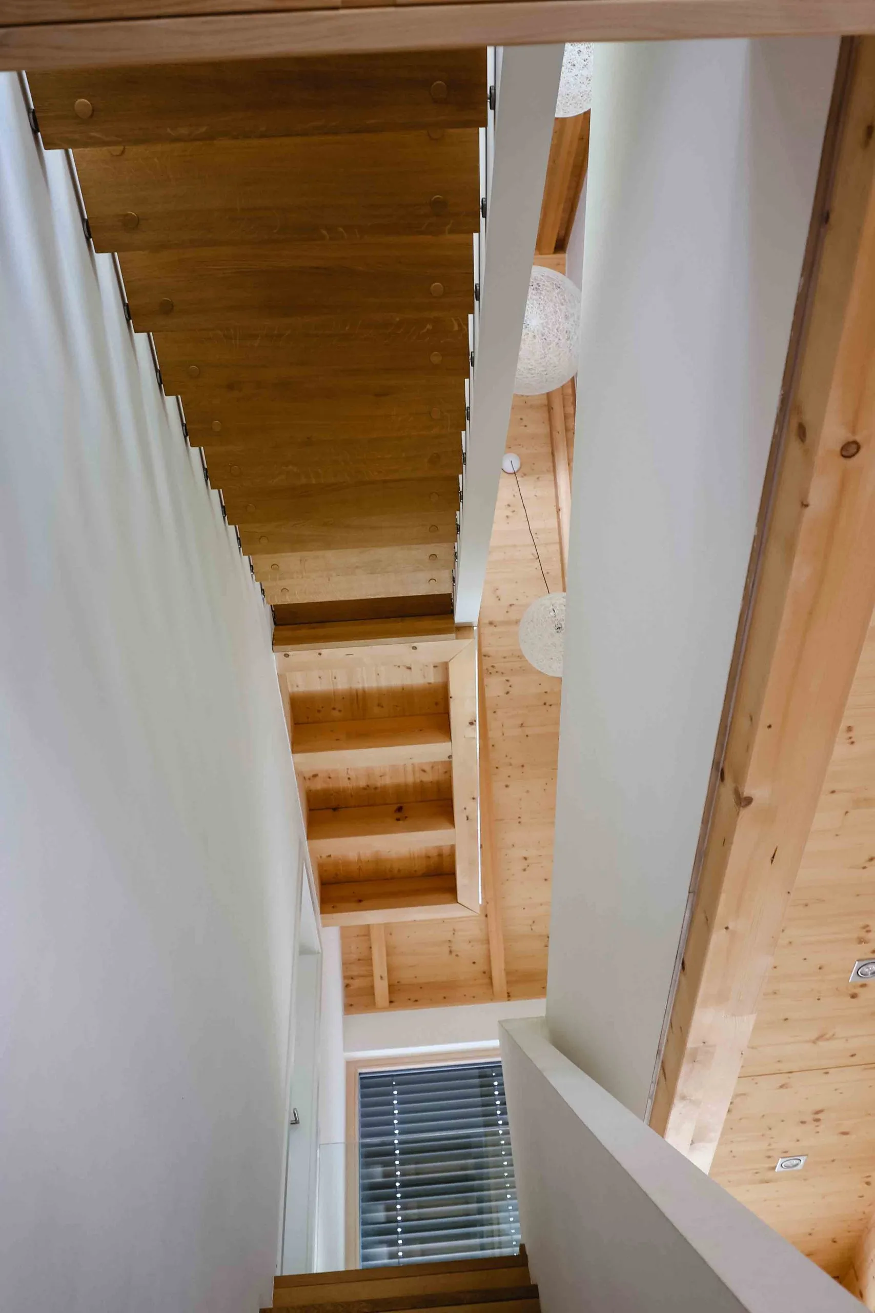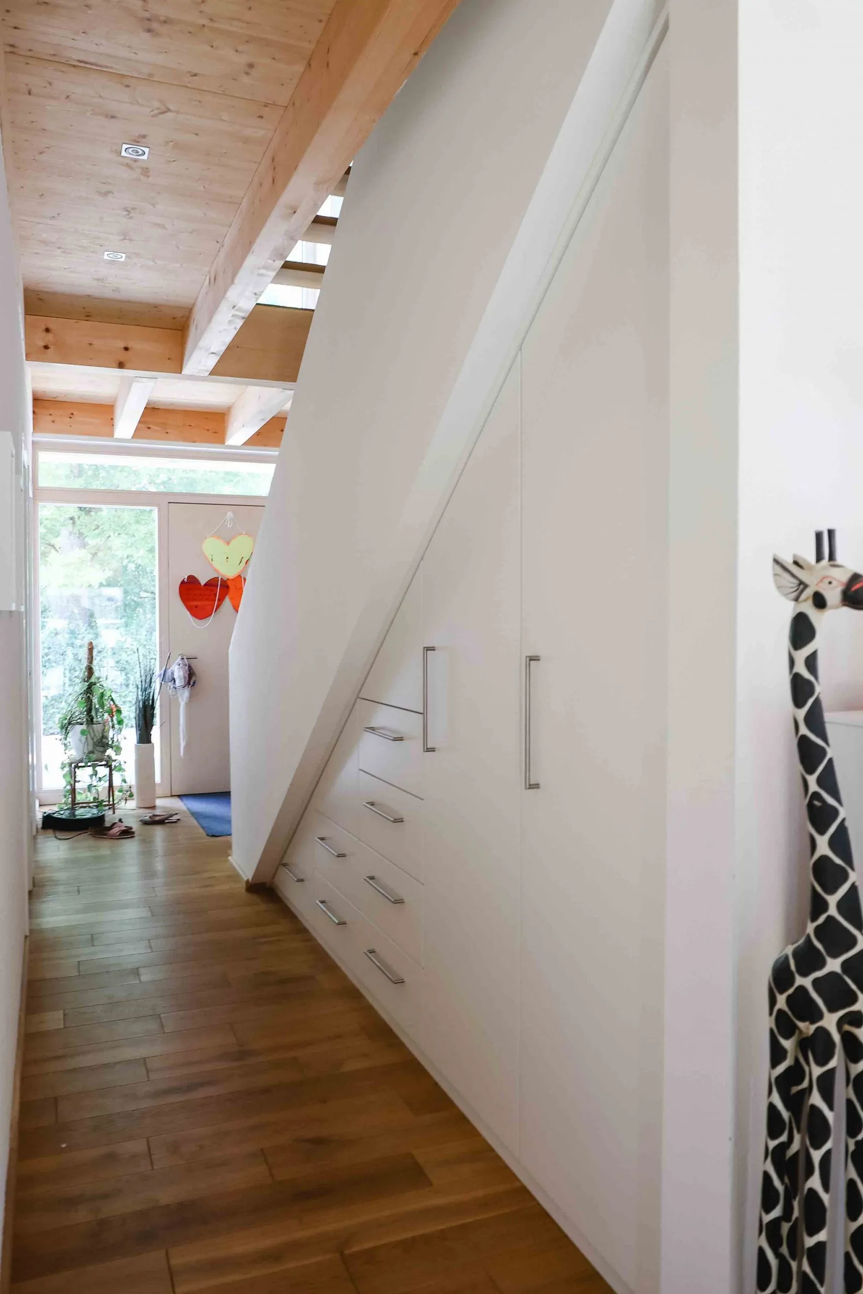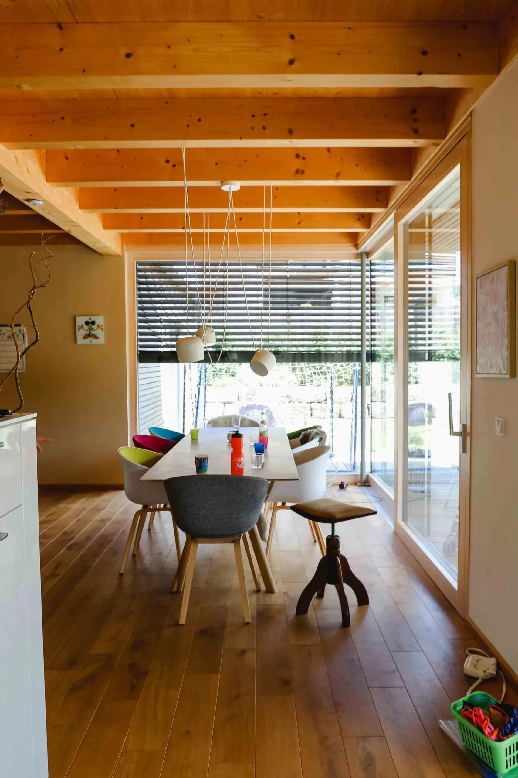 Steiles Dach ohne Dachüberstand, Garage und Anbau mit vorvergrauter Leistenschalung, Offenes Treppenhaus mit Galerie, Partyhaus im Garten, eindrucksvolle Sauna im Bad integriert